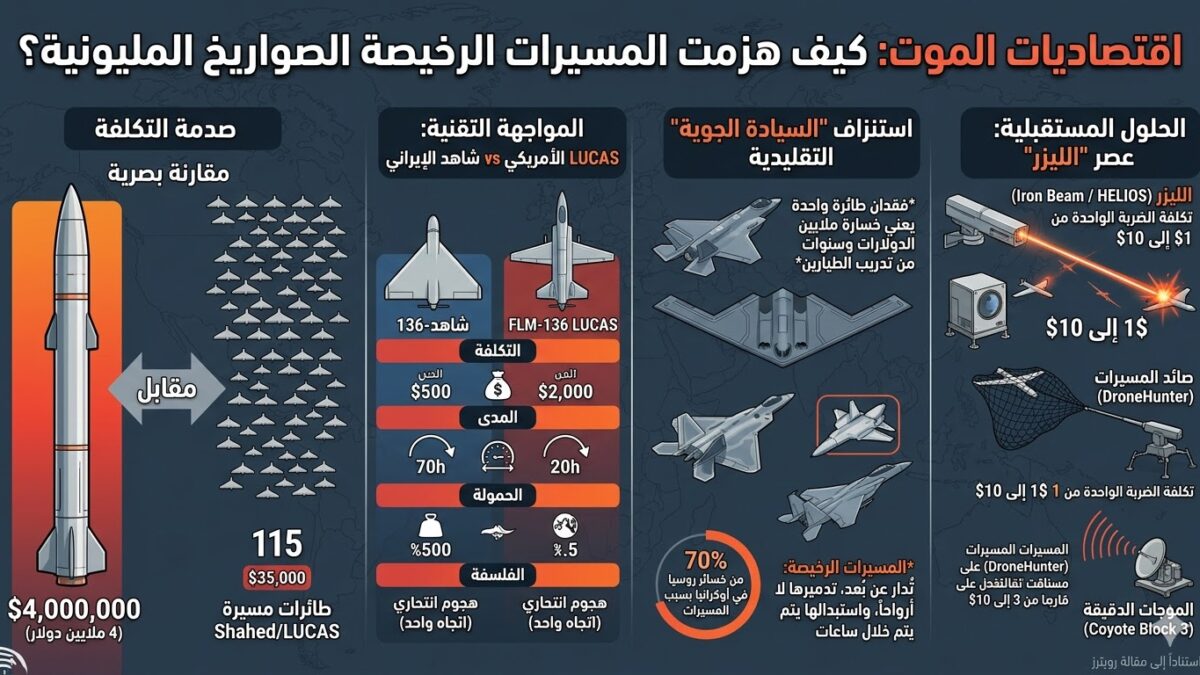 في المواجهة الدائرة مع إيران، تخوض الولايات المتحدة حربًا عن بُعد—بلا قوات برية—لكنها تواجه تحديًا غير مسبوق: كيف تواجه أسرابًا من الطائرات الرخيصة بصواريخ تكلف ملايين الدولارات؟