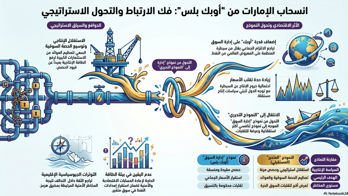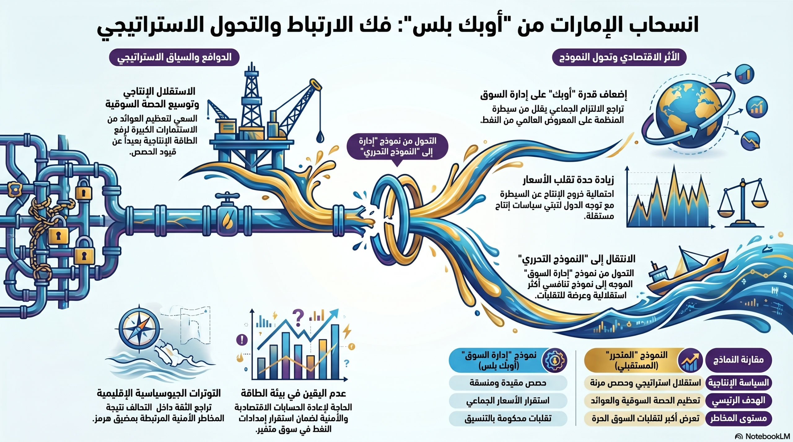 يعد قرار انسحاب الإمارات العربية المتحدة من منظمة الدول المصدرة للنفط (أوبك) وتحالف ” أوبك بلاس” تحولاً لافتاً في مسار سوق النفط العالمي، يتجاوز كونه خطوة فنية مرتبطة بحصص الإنتاج إلى كونه إعادة تموضع استراتيجي في بيئة طاقة تتسم بتسارع التغيرات وعدم اليقين.