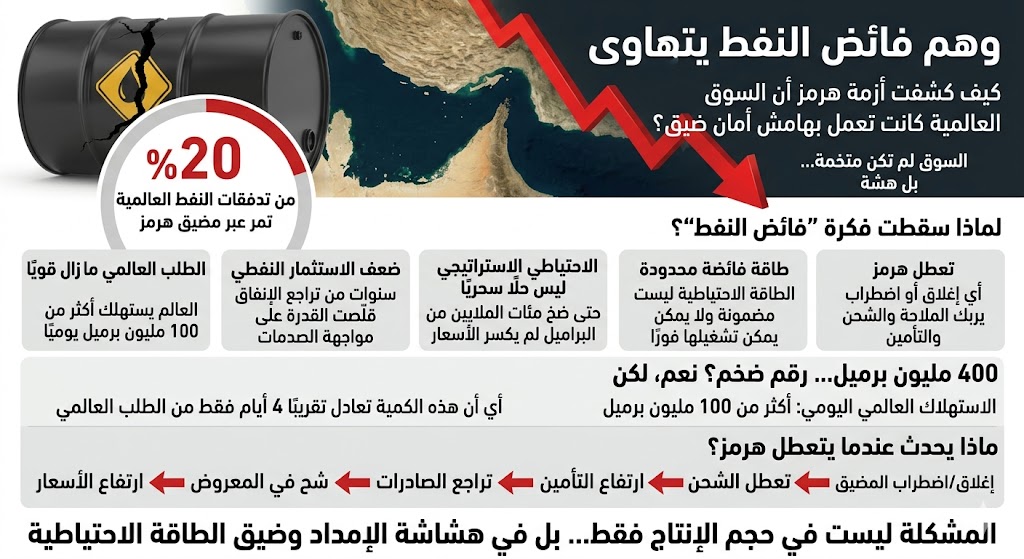 يرى المقال أن إغلاق مضيق هرمز وتعطل حركة الشحن أثبتا أن ما سُمّي لسنوات بـ”فائض النفط” لم يكن حقيقة راسخة، بل تصورًا مضللًا تجاهل أثر الجغرافيا السياسية. فالسوق، بحسب الكاتب، كانت متوازنة بشكل هش للغاية، وتعتمد على إمدادات محفوفة بالمخاطر وطاقة فائضة محدودة جدًا.