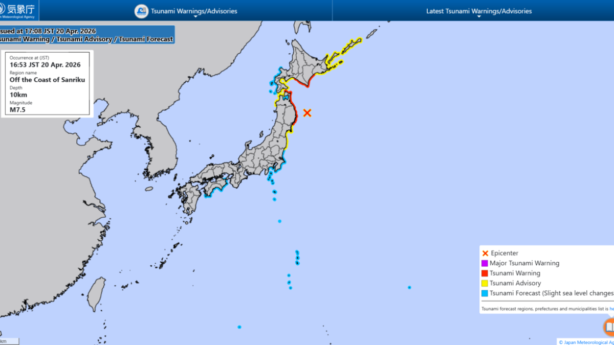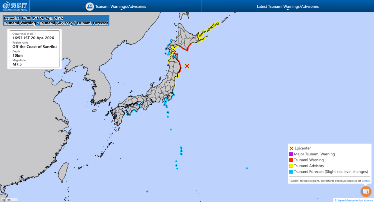 أصدرت  هيئة الأرصاد اليابانية  تحذيرًا من أمواج قد تصل إلى 3 أمتار.