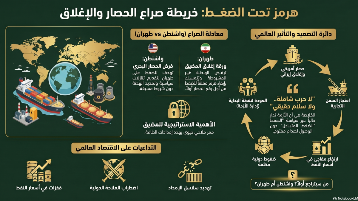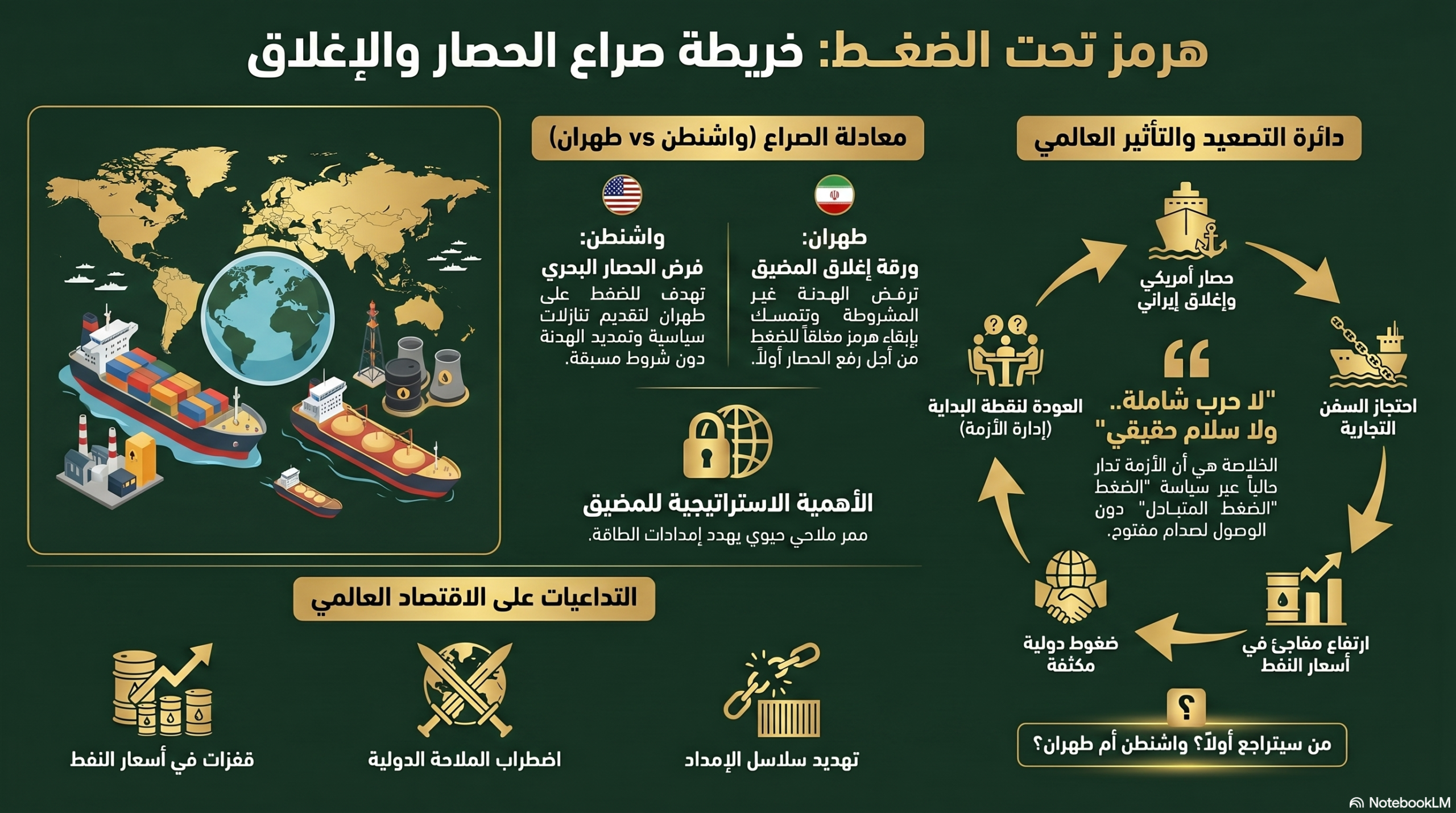 في لحظة تبدو فيها الحرب أقرب إلى التجميد منها إلى الحسم، تتكشف ملامح أزمة أكثر تعقيداً في قلب الممرات البحرية العالمية. فبين حصار بحري أميركي يضيّق الخناق على صادرات طهران، وإصرار إيراني على إبقاء مضيق هرمز مغلقاً كورقة ضغط، تتحول الهدنة المعلنة إلى إطار هش قابل للانفجار .