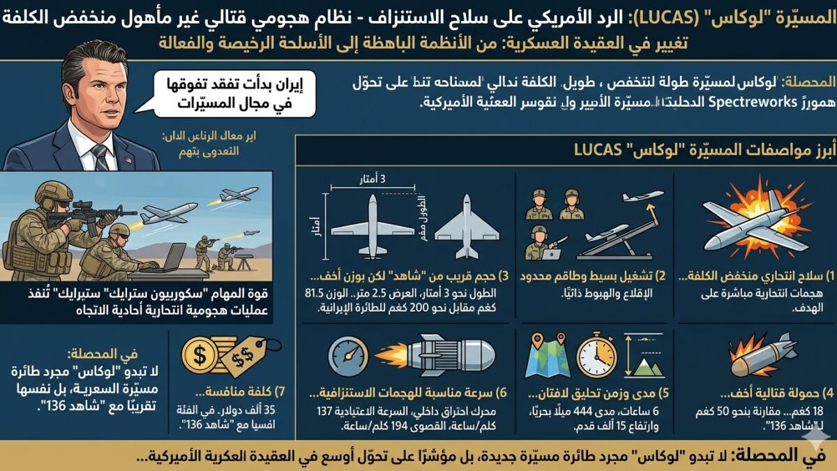 في المحصلة، لا تبدو “لوكاس” مجرد طائرة مسيّرة جديدة، بل مؤشرًا على تحوّل أوسع في العقيدة العسكرية الأميركية: من الاعتماد على الأنظمة الباهظة فقط، إلى تبني أسلحة رخيصة وفعالة قادرة على خوض حروب الاستنزاف الطويلة.