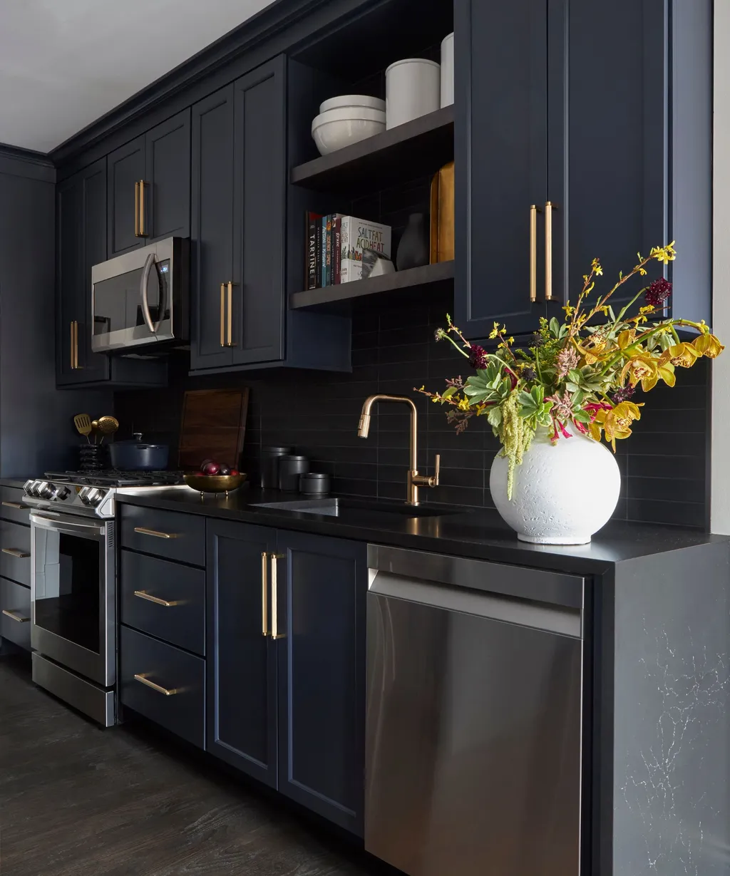 الأسود خيار جريء لكنه فعّال. بدل محاولة “تكبير” المطبخ بالألوان الفاتحة، يفضل بعض المصممين احتضان صغر المساحة ومنحها طابعًا دراميًا أنيقًا. الأسود يخلق تأثيرًا بصريًا قويًا، خاصة عند تنسيقه مع رخام أبيض أو لمسات معدنية دافئة.